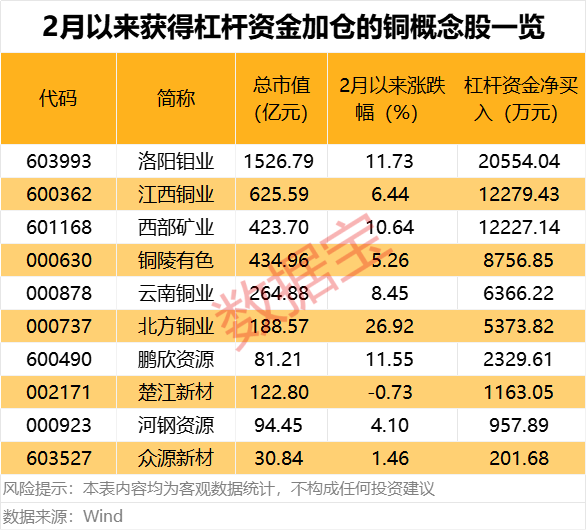 据证券时报·数据宝统计,今年以来铜概念股平均上涨9%。北方铜业年内累计上涨26.92%,精艺股份、金诚信、电工合金、紫金矿业等表现突出。其中,紫金矿业预计2024年净利润约320亿元,同比增长约51.5%;洛阳钼业、金诚信的2024年净利润预增下限分别为55.15%和48.37%。2月以来,洛阳钼业、江西铜业、西部矿业等10只铜概念股获得杠杆资金加仓。