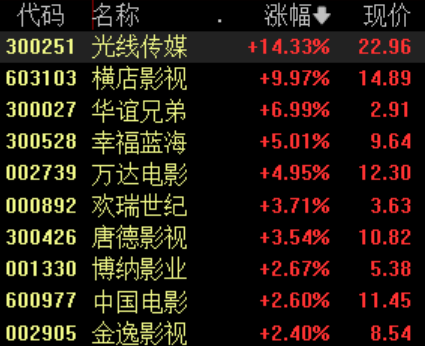 2月12日,影视院线板块直线拉升,截至发稿,光线传媒涨超14%,股价续创历史新高;横店影视涨停,华谊兄弟涨近7%,幸福蓝海、万达电影、欢瑞世纪等多股跟涨。