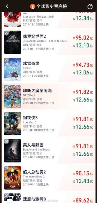 消息面上,据网络平台数据,截至2月11日19时03分,《哪吒之魔童闹海》总票房(含预售)突破90亿元,成为中国影史首部票房破90亿元的影片。截至2月12日,影片《哪吒之魔童闹海》总票房(含预售)突破12.66亿美元, 超过《钢铁侠3》《美女与野兽》,进入全球影史票房榜前24名,即将超越《冰雪奇缘》。