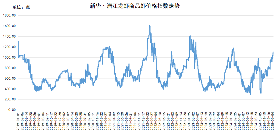 新华财经北京2月12日电(韩燕)春节后第一周,小龙虾部分主产区存塘陆续减少,价格持续回升,本期价格指数增幅扩大。新华指数监测数据显示,截至2月10日,新华·潜江龙虾商品虾价格指数报1073.83点,环比上期(2025年1月20日,下同)上涨69.14点,涨幅6.88%;较基期(2019年1月1日,下同)上涨73.83点,涨幅7.38%。