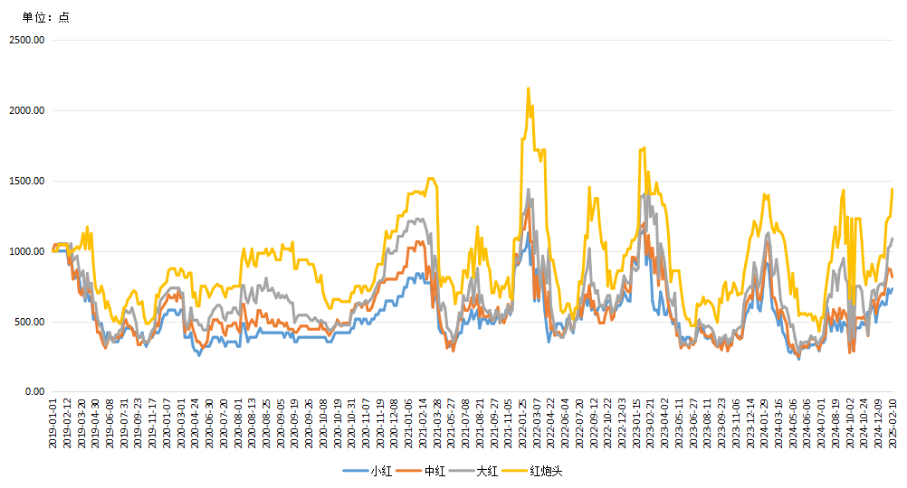 供给端,虽然近年随着小龙虾养殖规模扩大,产业水平参差不齐,但由于冬季原本是小龙虾供应量紧缺期,春节结束后,气温维持较低水平,部分小龙虾产区供应量持续减少;需求端,25年春节较往年提前,春节小龙虾消费提振,导致节后第一周小龙虾持续出现供应空缺,总体供不应求,对比去年同期小龙虾价格小幅上涨。本期新华·潜江龙虾商品虾价格指数对比2024年同期(2024年2月10日)上涨71.82点,涨幅7.17%,其中大虾同比上涨较大为162.72点,涨幅为21.53%。