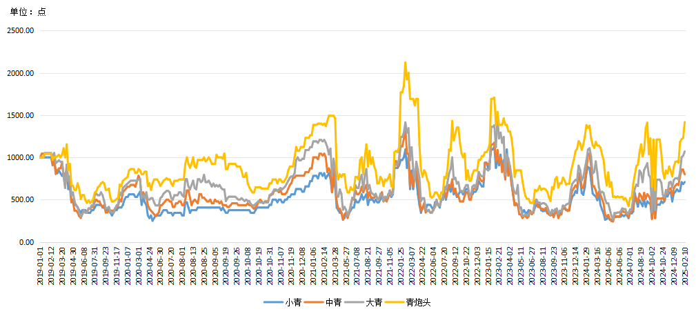 分品类来看,红虾和青虾市场行情均显著提升。截至2月10日,红虾价格指数报1084.73点,环比上涨6.93%;青虾价格指数报1063.14点,环比上涨6.83%。