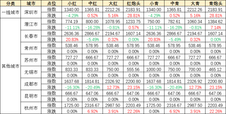 截至2月10日,红虾均价报53.42元/斤,环比上涨6.93%。其中,小红均价报22.67元/斤,环比上涨4.45%;中红均价报36.73元/斤,环比下跌5.97%;大红均价报62.08元/斤,环比上涨4.89%;红炮头均价报92.22元/斤,环比上涨15.44%。青虾均价报53.42元/斤,环比上涨6.83%。其中,小青均价报22.67元/斤,环比上涨3.50%;中青均价报36.73元/斤,环比下跌5.97%;大青均价报62.08元/斤,环比上涨4.89%;青炮头均价报92.22元/斤,环比上涨15.44%。
