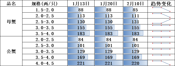 螃蟹产地交易方面,本期各规格价格稳中有跌。截至2025年2月10日,各规格母蟹价格中1.5-2.0规格报85元/公斤,跌幅较大为3.41%;各规格公蟹价格中4.0-4.5规格报220元/公斤,跌幅较大为0.45%。