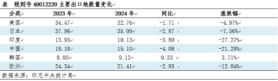 根据印尼中央统计局公布的数据显示,印尼2024年天然胶出口总量为166.49万吨,同比减少12.67万吨,跌幅7.07%,为2014年有统计以来最低水平。印尼出口量的下滑一方面跟印尼国内产量下滑有关,印尼因树龄结构老化不可逆,天然橡胶单产下滑;同时棕榈效益好导致劳工分流;伴随近几年上游加工厂产能出清,产量下滑。另一方面印尼出口主要面向国际市场,但2024年受《防止森林砍伐条例》(EUDR)政策影响,一定程度上拖累出口情况。