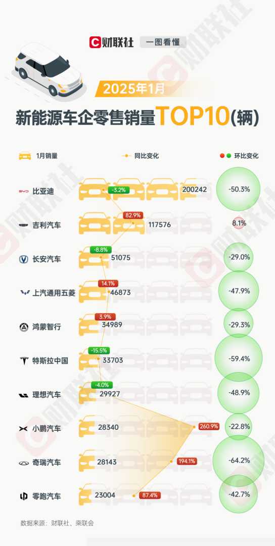 1月新能源车企销量TOP10榜单出炉,比亚迪虽稳居榜首但环比腰斩,吉利表现亮眼位居第二。乘联会预计今年车市在政策作用下呈前低后高态势。