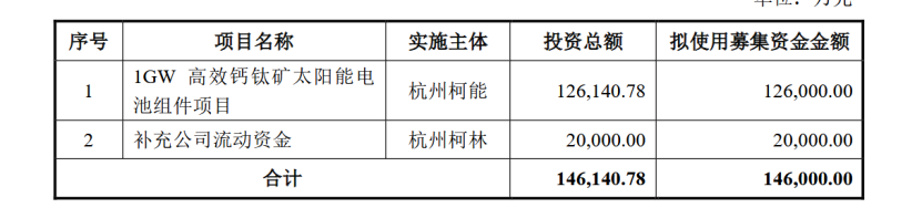 杭州柯林表示,本次发行的募集资金将助力公司钙钛矿太阳能电池组件项目的推进,不涉及对现有业务及资产的整合,主营业务不变。