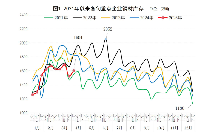 中国钢铁工业协会发布数据,2025年4月上旬重点统计钢铁企业钢材库存量为1604万吨,环比增5.3%,同比降幅超12%。西北地区库存下降,其他地区增长。