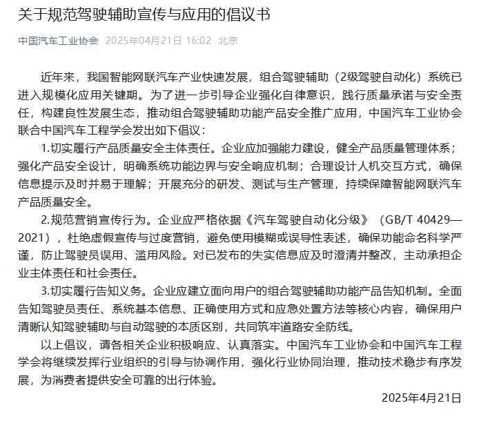 我们诚挚呼吁各相关企业积极响应并认真落实上述倡议。中国汽车工业协会和中国汽车工程学会将持续发挥行业引领与协调作用,加强行业协同治理,推动技术稳健有序发展,为消费者提供更加安全可靠的出行体验。