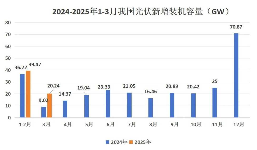 国家能源局最新数据显示,2025年1至3月我国光伏新增装机达59.71GW,同比上升30.5%,其中3月单月光伏新增装机达20.24GW,同比大增。截至3月末,全国太阳能发电装机容量达9.5亿千瓦,同比增长43.4%。