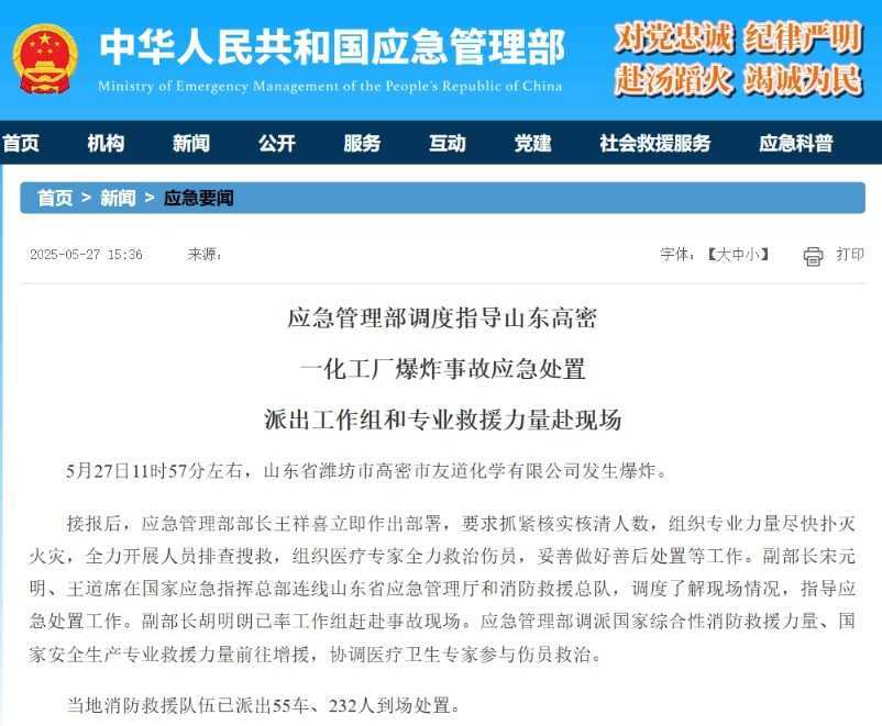 5月27日,山东潍坊市高密市友道化学有限公司发生爆炸事故,应急管理部迅速部署救援,当地消防力量全力处置。此次事故再次提醒安全生产的重要性。