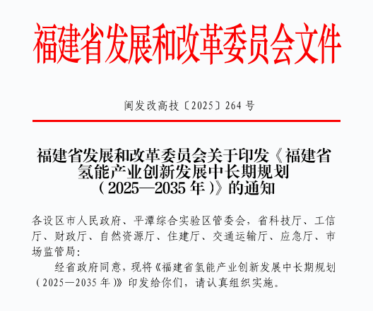 按下氢能产业创新发展“快进键”,福建省出新招。6月18日,福建省发展和改革委员会官网发布关于印发《福建省氢能产业创新发展中长期规划(2025—2035年)》(简称“规划”)的通知,并发布相关政策内容解读文件。