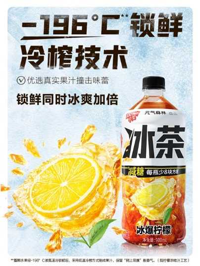 2022年底,独角兽品牌元气森林重构传统配方,创新推出以“真茶真果汁+减糖”为卖点的即饮冰茶,采用斯里兰卡红茶和整颗柠檬榨取,减糖配方比普通冰红茶每瓶减少8块方糖。2024年,研发团队率先将-196℃液氮冷冻工艺运用于饮料生产,打造出无限接近手打饮料的口感。相比经典冰红茶减少25%糖量的冰茶实现了口感好喝与成分天然,定价在5元,瞄准便利店及线上渠道。根据食品板报道,元气森林冰茶2024年销量预计突破10亿,对比2023年2亿左右的销量同比增长500%。