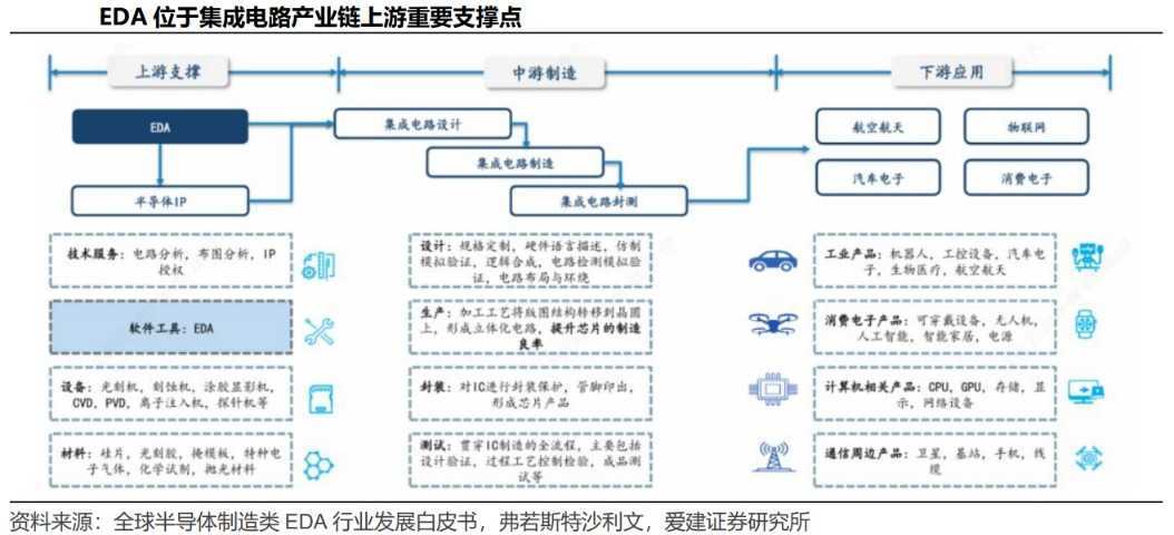 慧博投研近日发布研究报告,对EDA行业进行深度点评。EDA(电子设计自动化)作为半导体产业链上游核心技术,是利用计算机辅助完成集成电路设计、仿真、验证的全流程工具链,直接决定芯片性能与产业创新能力。按应用场景可分为前端设计、后端设计、制造衔接类工具,贯穿IC设计至制造全流程,其中设计阶段需通过仿真工具降低流片成本,制造阶段依赖器件建模工具保障工艺实现,技术壁垒极高。