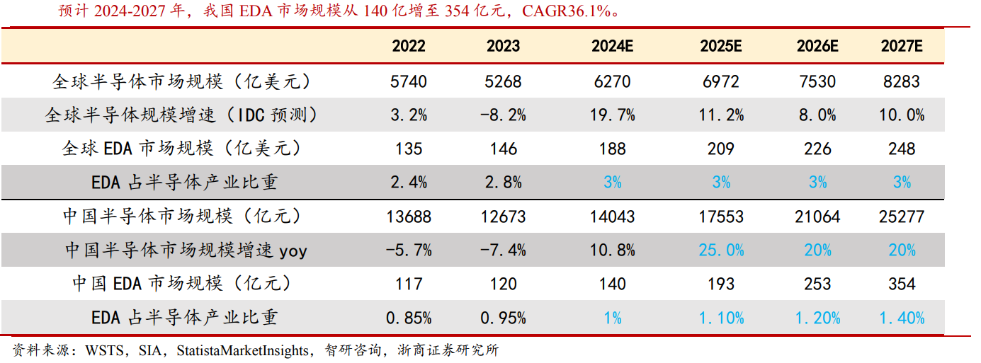 市场空间方面,预计2024-2027年中国EDA市场规模从140亿增至354亿元,CAGR达36.1%,核心假设包括全球半导体市场增长中枢10%、中国增速20%、EDA占比提升至1.3%。国内相关公司中,华大九天实现模拟电路设计全流程自主可控,物理验证工具Argus通过三星认证;概伦电子Semi Spice仿真器支持3/4nm工艺;广立微(301095)WAT测试方案达国际水平,2023年收购亿瑞芯拓展设计类EDA。
