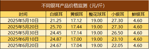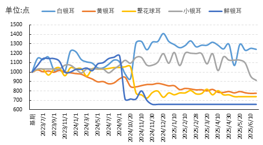 从产品维度来看,截止6月20日,白银耳价格指数报1239.53点,较上期下跌0.80%;黄银耳价格指数报777.87点,较上期上涨0.24%;整花球耳价格指数报741.49点,较上期持平;小银耳价格指数报911.16点,较上期下跌4.55%;鲜银耳价格指数报657.14点,与上期持平。