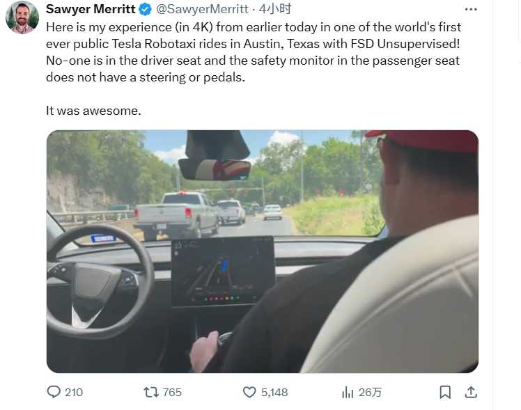 索耶·梅里特评价Robotaxi的乘坐体验“棒极了”