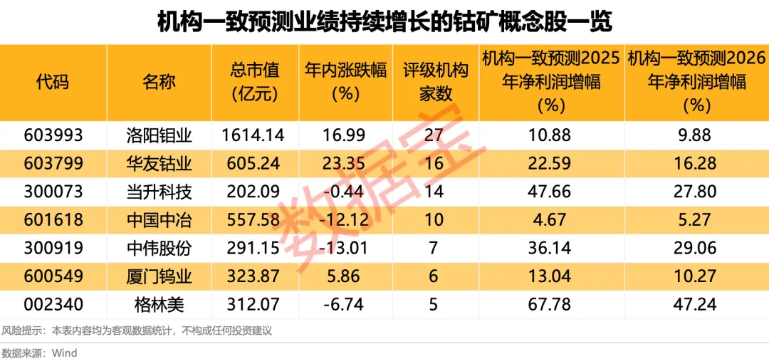 钴矿概念股中,有7股获得5家及以上机构给予评级,且机构一致认为2025—2026年业绩有望持续增长,包含洛阳钼业、华友钴业、当升科技、中国中冶等。