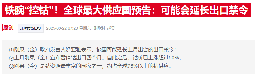 据了解,该禁令始于今年2月22日,原定的期限为4个月。财联社先前报道曾提到,今年3月时,刚果(金)政府发言人姆亚雅(Patrick Muyaya)曾表示,该国可能会延长出口禁令。