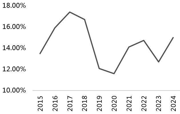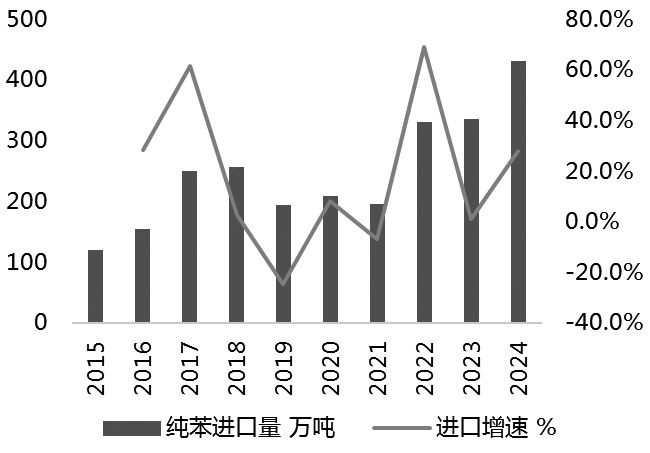 中国是全球纯苯最大消费国与进口国,2020—2024年进口量逐年上升,主要来自周边亚洲国家。进口节奏分三阶段:2015—2018年需求驱动增长,2019年下降,2020—2024年显著提升。