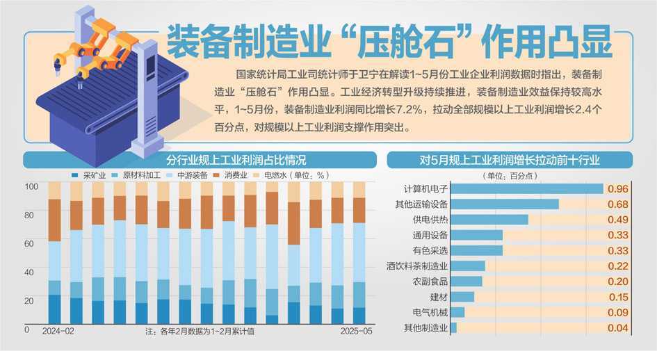 于卫宁表示,装备制造业“压舱石”作用凸显。工业经济转型升级持续推进,装备制造业效益保持较高水平,1~5月份,装备制造业利润同比增长7.2%,拉动全部规模以上工业利润增长2.4个百分点,对规模以上工业利润支撑作用突出。