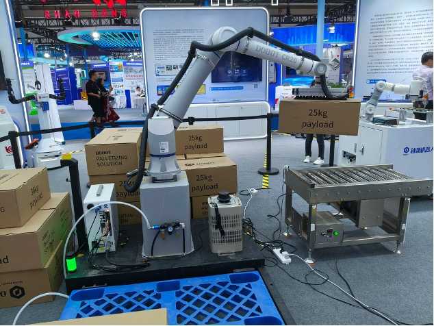 在越疆(02432.HK)展台,其协作机器人正在演示货物搬运。越疆还在本届中博会期间全球首发了新品CR 30H,该机器人搭载HyperMove运动控制算法、极速动力引擎等,关节刹车采用电磁抱闸。