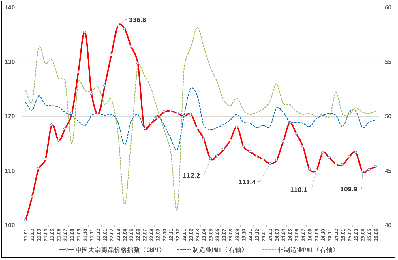 5日,由中物联大宗商品流通分会和上海钢联等单位联合调查,中国物流与采购联合会发布的2025年6月份中国大宗商品价格指数(CBPI)为110.8点,环比上涨0.5%,同比下跌5.2%。