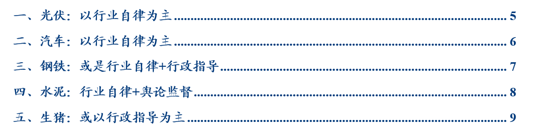 1)光伏:以行业自律为主。2)汽车:以行业自律为主。3)钢铁:或是行业自律+行政指导。4)水泥:行业自律+舆论监督。5)生猪:或以行政指导为主。
