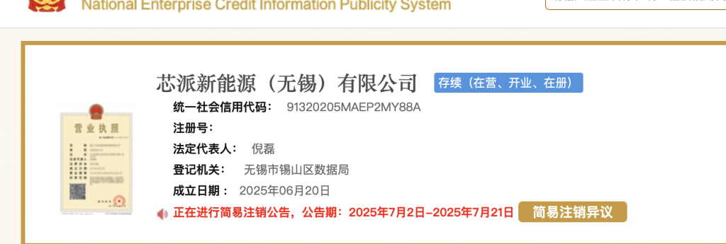 7月8日,国家企业信用信息公示系统显示,成立于2025年6月20日的芯派新能源(无锡)有限公司(下称“芯派新能源”)正在进行简易注销公告,公告日期为2025年7月2日至7月21日。