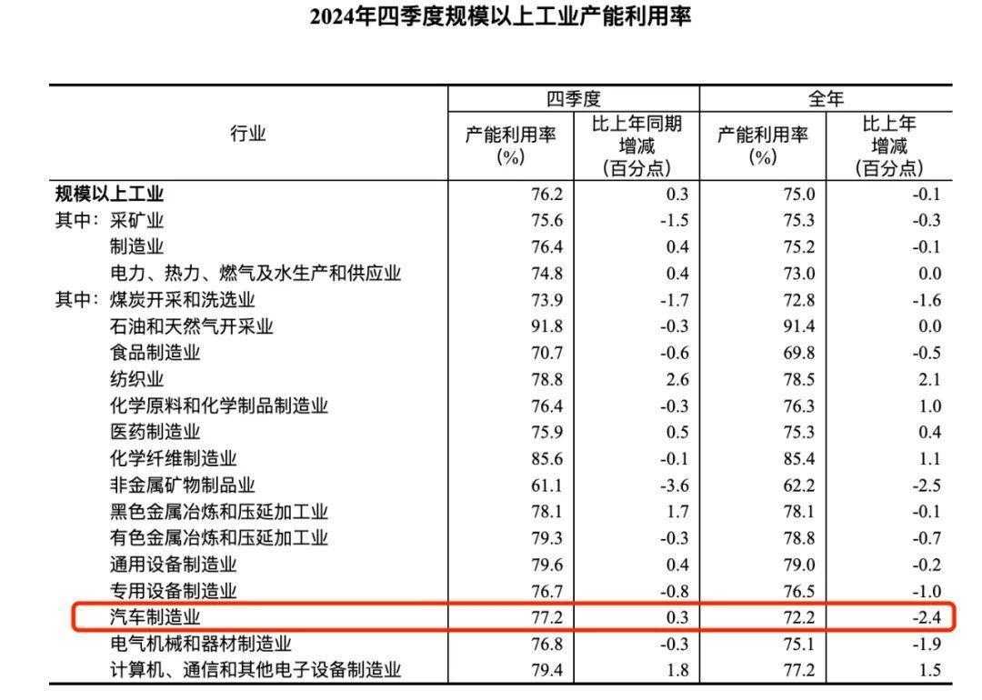 产能问题近年来一直是行业关注的焦点之一。根据国家统计局数据,2024年全年,汽车制造业产能利用率为72.2%,相较于上一年下降了2.4个百分点,且略低于规模以上工业75.0%的利用率。而在2017年,我国汽车制造业的产能利用率曾处于82.2%的高位。