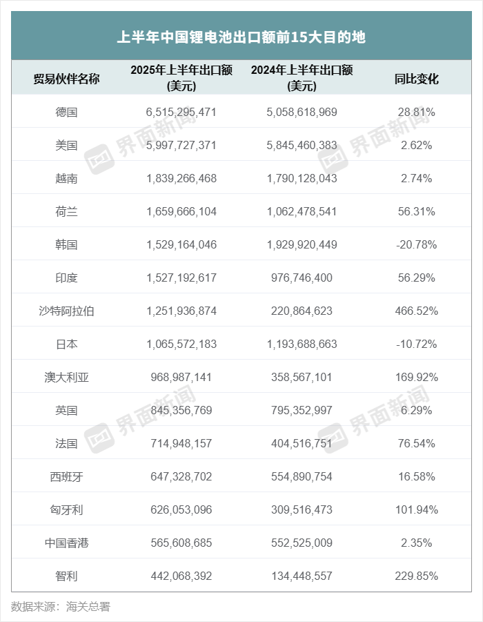 今年1-6月,中国锂离子电池前五大出口目的地分别为德国、美国、越南、荷兰和韩国,排名较上年同期出现了较多变化。