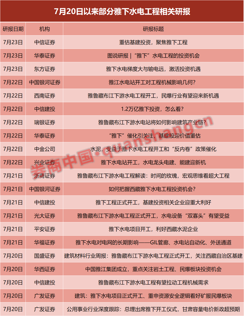 券商中国记者梳理发现,券商本周掀起雅下水电工程研究热潮。Wind数据显示,自上周末以来,已有20余家券商发布超40篇相关研报,涵盖多个行业,并且不少研报登上热门。