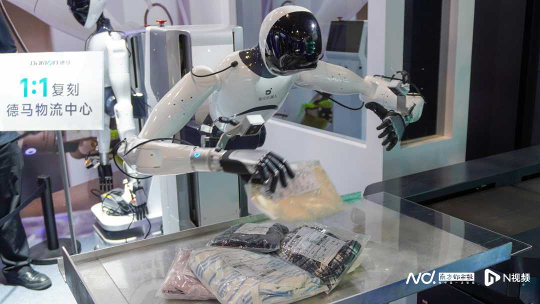 7月27日,智元和智能物流装备提供商德马(688360.SH)合作,直播演示机器人的分拣能力。WAIC展厅内,智元1:1复刻了德马物流中心的作业场景。置身其中的轮式人形机器人精灵G1用五指灵巧手抓起快递包裹,在条码扫码设备配合下录入信息。国外人形机器人明星公司Figure AI此前也发布过类似作业的视频。