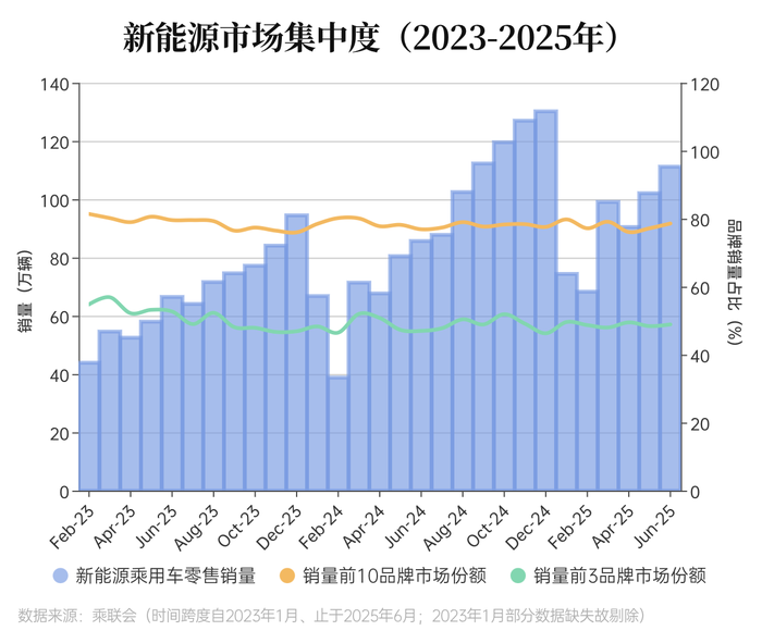 界面新闻统计了2023年至今每月汽车市场销量前十厂商和前三厂商的市场份额,CR10从2023年的59%提升至2025年的65%左右,CR3也从27%提升至35%。