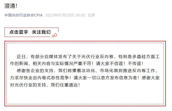 7月29日,中国光伏行业协会发布澄清公告:近日,有部分自媒体发布了关于光伏行业反内卷,特别是多晶硅方面工作的新闻,相关内容与实际情况严重不符!请大家不信谣!不传谣!感谢各企业的支持,我们将秉着法治化、市场化原则推进反内卷工作,力求尽快走出内卷式恶性竞争!请大家一切以官方发布信息为准!感谢大家对光伏行业的支持,我们任重道远!