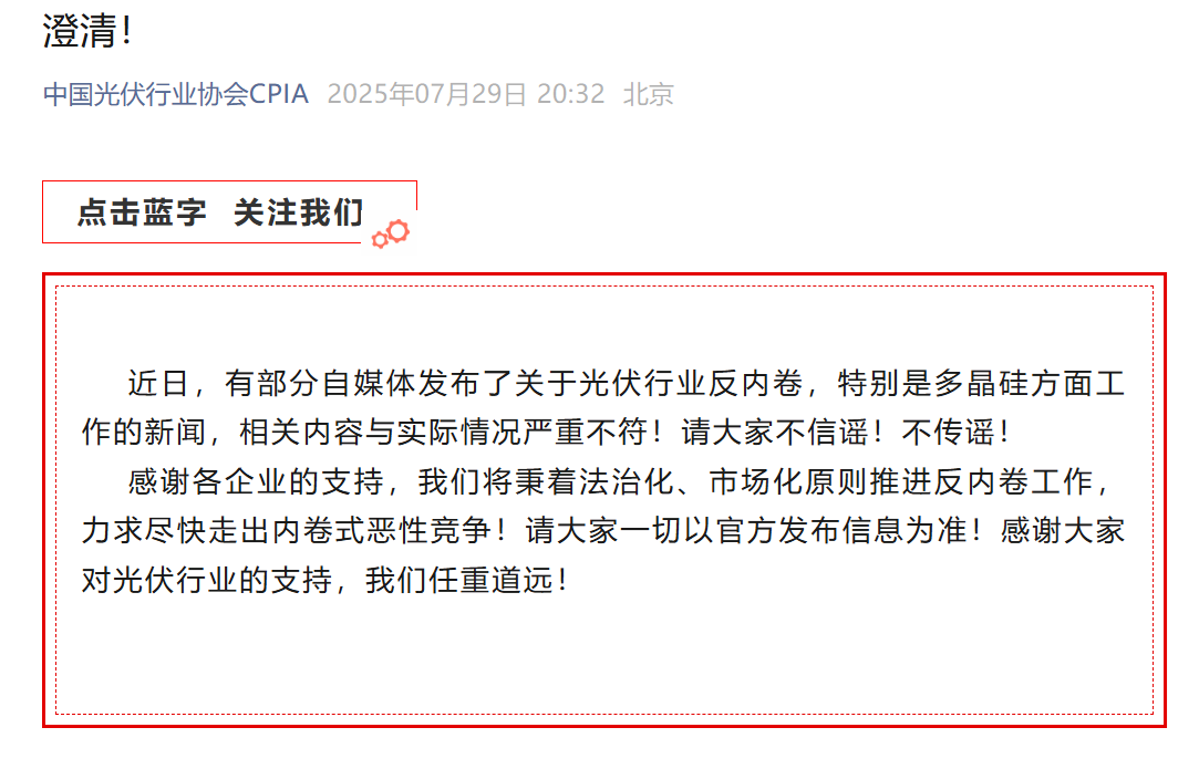 7月29日,中国光伏行业协会发布辟谣公告,称部分自媒体关于光伏行业反内卷,特别是多晶硅方面的新闻与实际情况不符,呼吁不信谣不传谣。