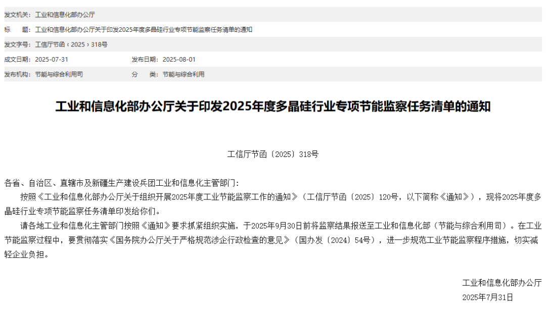 8月1日,工业和信息化部印发2025年度多晶硅行业专项节能监察任务清单,要求各地工业和信息化主管部门按照通知要求抓紧组织实施,于2025年9月30日前将监察结果报送至工业和信息化部。