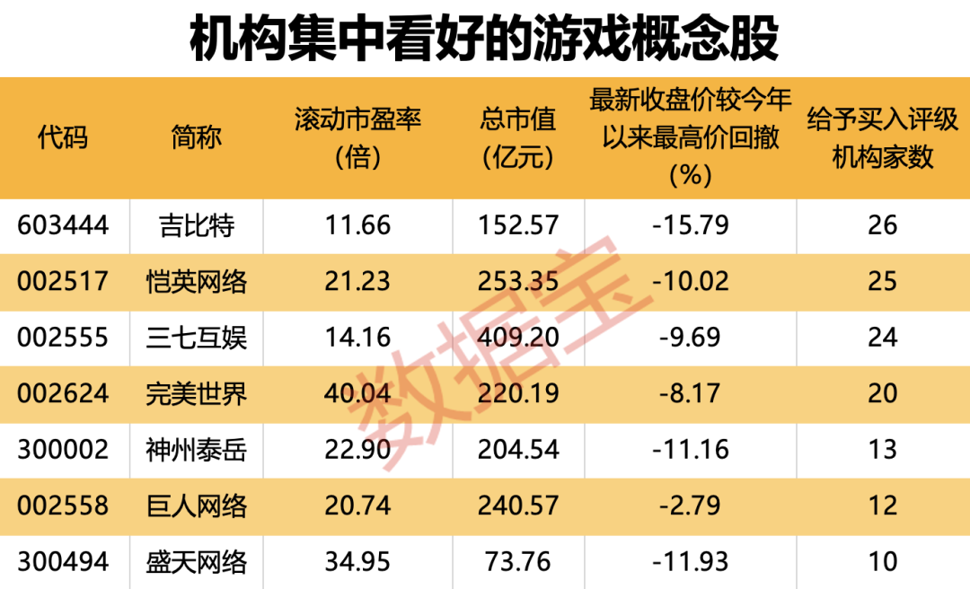 此外,从机构评级角度来看,7只概念股获得10家及以上机构给予买入评级,其中吉比特最受券商机构青睐,合计获得26家券商研报覆盖。