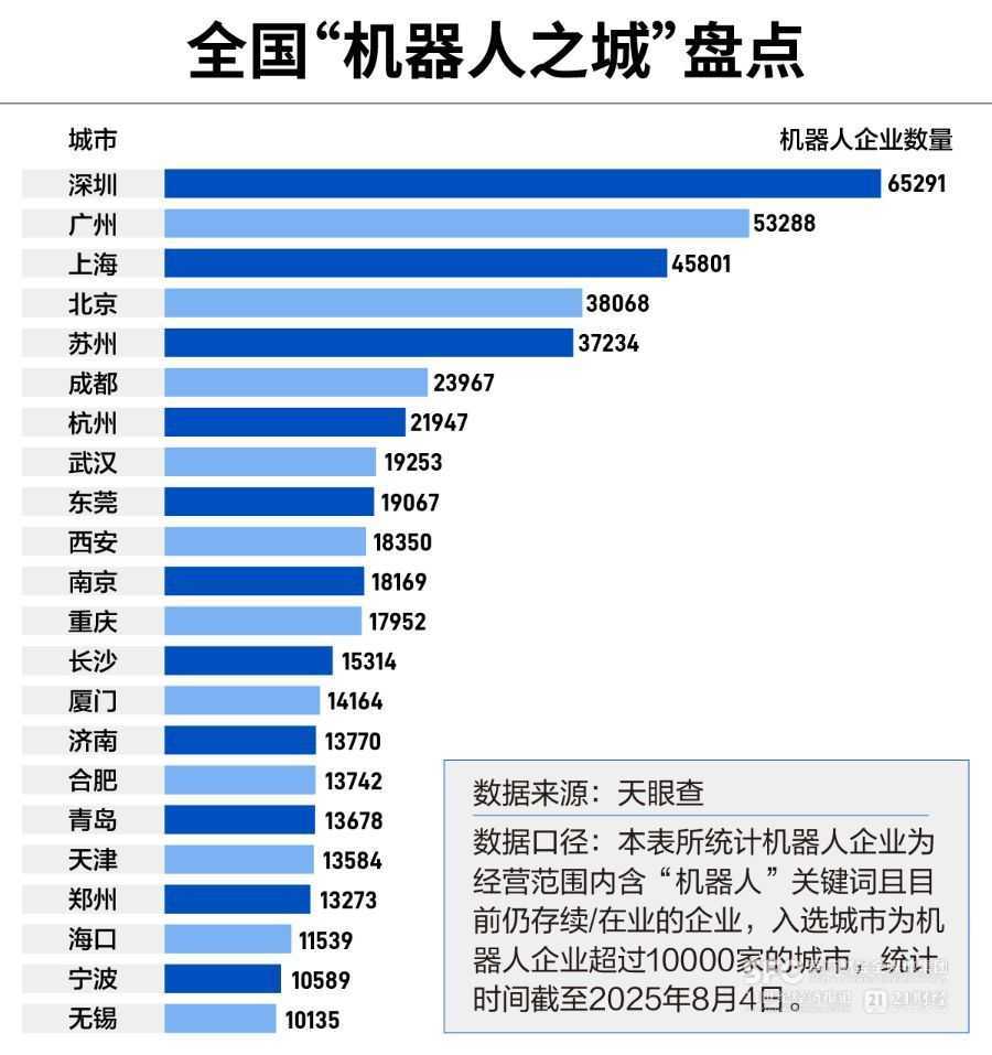 风口之下,哪些城市脱颖而出?据南方财经记者在天眼查平台统计,截至2025年8月4日,全国已有22座城市机器人企业数量破万,深圳、广州、上海领跑全国。北京、苏州紧随其后,企业数量均突破3万家。