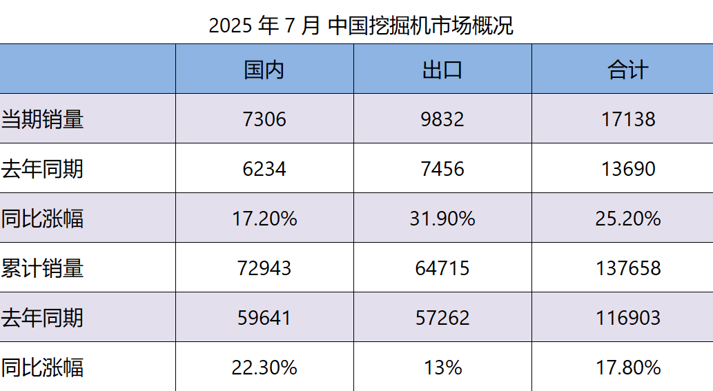 据中国工程机械工业协会统计,今年7月,挖掘机主要制造企业销售各类挖掘机17138台,同比增长25.2%。其中,国内销量7306台,同比增长17.2%;出口9832台,同比增长31.9%;销售各类装载机9000台,同比增长7.41%。其中国内销量4549台,同比增长2.48%;出口4451台,同比增长13%。