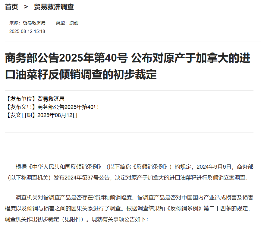 新华财经北京8月12日电据商务部12日公布对原产于加拿大的进口油菜籽反倾销调查的初步裁定。根据公告,调查机关初步认定,原产于加拿大的进口油菜籽存在倾销行为,这一行为导致中国国内油菜籽产业受到实质损害,且倾销与实质损害之间存在明确的因果关系。基于此,调查机关决定采用保证金形式来实施临时反倾销措施。自2025年8月14日起,进口经营者在进口被调查产品时,需依据本初裁决定所确定的各公司的保证金比率,向中华人民共和国海关提供相应的保证金。