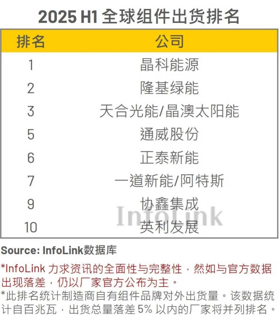 据InfoLink调研,2025年上半年全球前十大组件供货商总出货量约247.9GW,较去年同期增长10%。第一梯队前四家大者恒大,出货占比接近总量的六成:晶科能源以些微差距夺得榜首,隆基绿能占据第二,两者在上半年已逐步拉开与其他企业的出货差距。天合光能与晶澳太阳能并列第三。第二梯队中,第五、第六名依序是通威股份、正泰新能,一道新能与阿特斯并列第七,第九名与第十名分别是协鑫集成和英利发展。