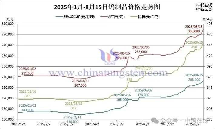 8月15日,最新市场数据显示,钨制品全线上涨。其中,APT(仲钨酸铵)报价达到30万元/吨,黑钨精矿、白钨精矿(≥65%)同步突破20万元/吨大关,与年内低价相比,价格涨幅均达到了45%,已远超2011年的峰值。
