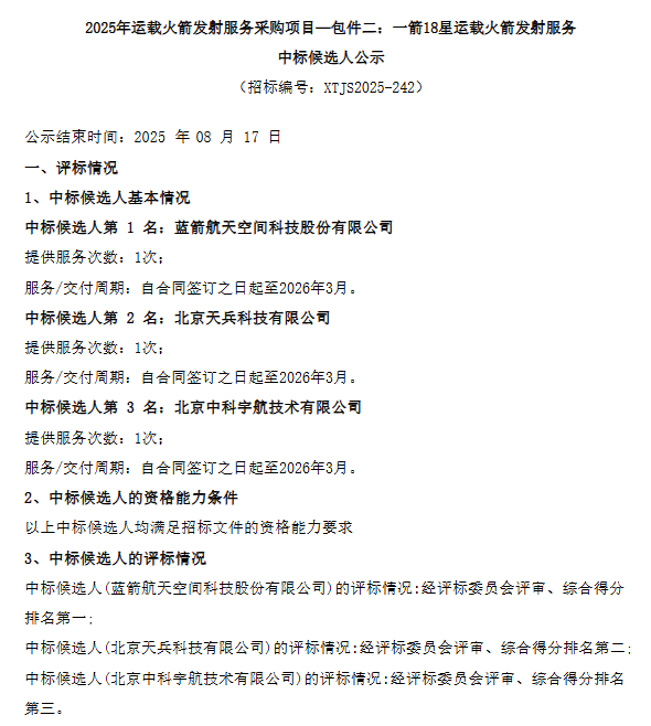 8月14日,千帆星座的建设与运营商垣信卫星在中国招投标公共服务平台上发布了《2025年运载火箭发射服务采购项目一包件二:一箭18星运载火箭发射服务中标候选人公示》,蓝箭航天、天兵科技和中科宇航入围候选人,综合得分依次为第一到第三。三家火箭公司提供服务次数均为1次,服务/交付周期均为自合同签订之日起至2026年3月。