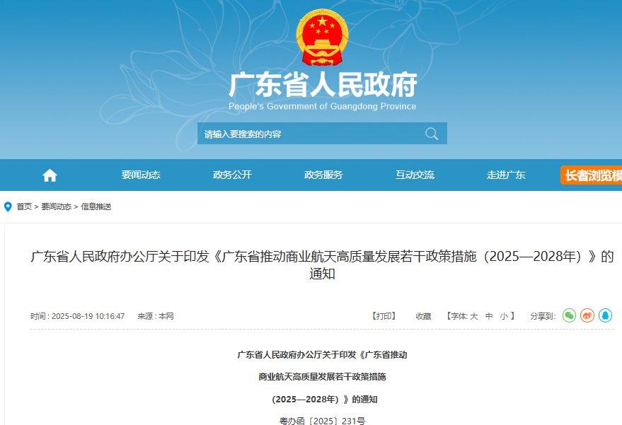 8月19日,广东省人民政府办公厅发布《广东省推动商业航天高质量发展若干政策措施(2025—2028年)》。