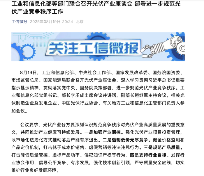 8月19日晚,工信部官微“工信微报”发文称,当日,六部委联合召开光伏产业座谈会,进一步规范光伏产业竞争秩序。