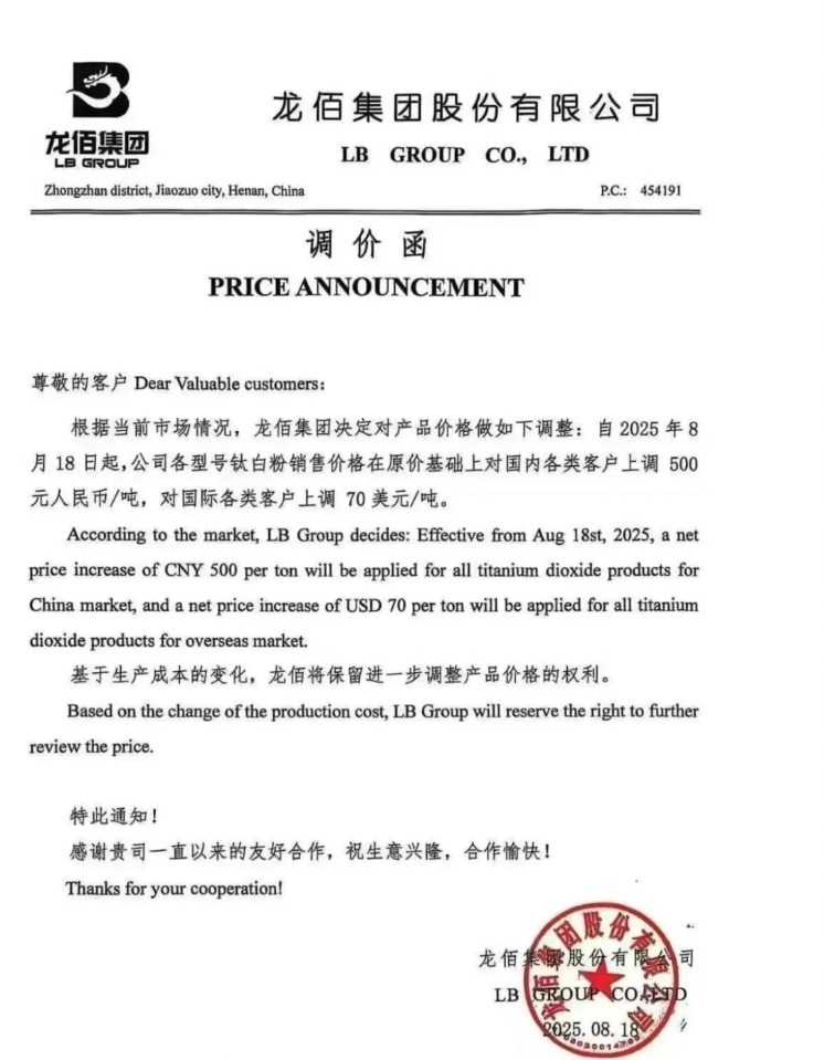 近日,钛白粉龙头龙佰集团发布涨价函:8月18日起,公司各型号钛白粉销售价格上调,其中国内客户上调500元/吨,国际客户上调70美元/吨。基于生产成本的变化,龙佰将保留进一步调整产品价格的权利。钛白粉市场这一变动,无疑吸引了众多目光。