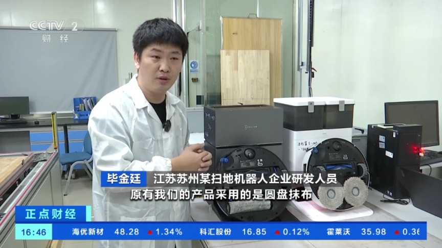 江苏苏州某扫地机器人企业研发人员毕金廷:原有我们的产品采用的是圆盘抹布,它随着使用过程中它会越拖越脏。我们这台机器采用(的)是滚筒自清洁的技术,它内部还会有一个水箱,在过程中它会不断清洗滚筒抹布,保证滚筒抹布的清洁,扫地机器人清洁技术升级。
