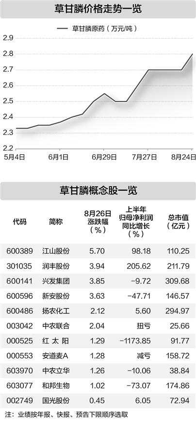 据证券时报·数据宝统计,A股中布局草甘膦的个股共有11只,8月26日集体上涨,平均涨幅2.42%,江山股份、润丰股份、兴发集团涨幅居前,分别为5.7%、3.94%、3.85%,草甘膦相关股票表现活跃。