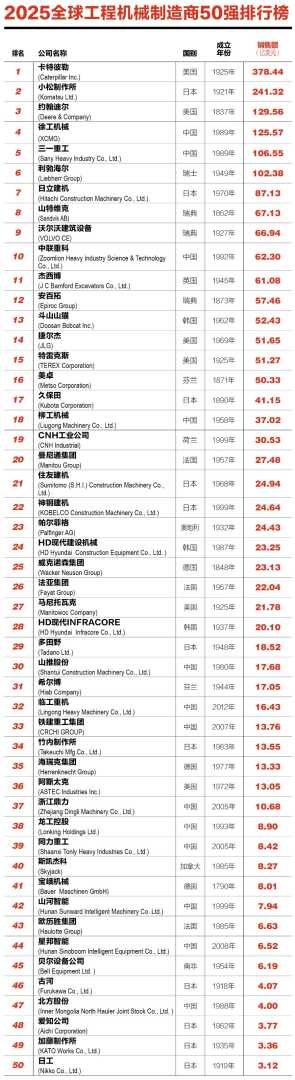 全球工程机械制造商50强榜单,由全球工程机械50强峰会组委会和《中国工程机械》杂志联合发布,自1999年首次发榜至今,已持续发布26届,成为观察行业发展的重要窗口。